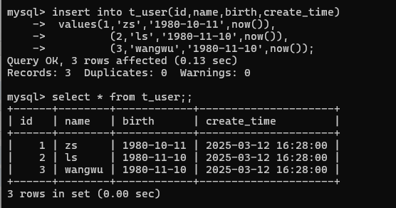 insert into 表名(字段1,字段2,字段3...) values(值1,值2,值3...),(),();