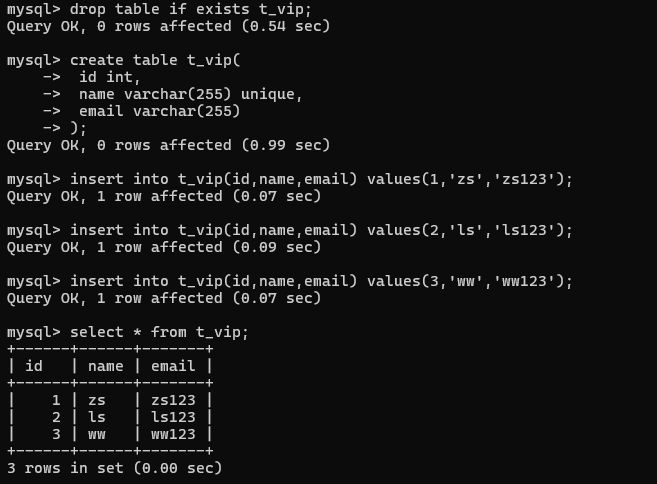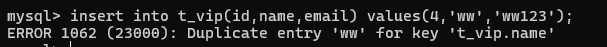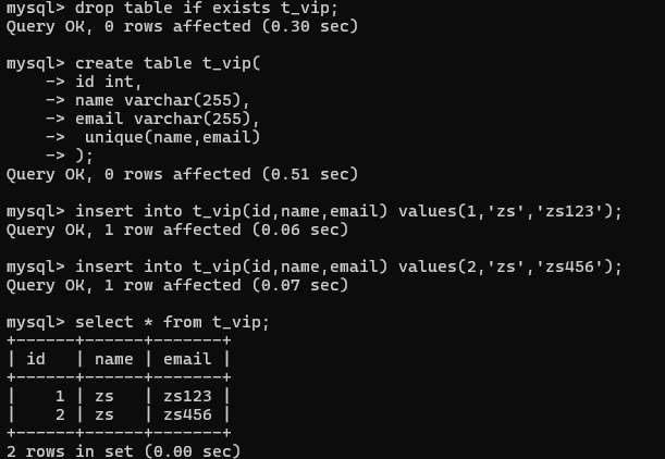 新需求:name和Email两个字段联合起来具有唯一性,创建格式如下,这种联合约束不是添加在字段后面,被称为表级约束