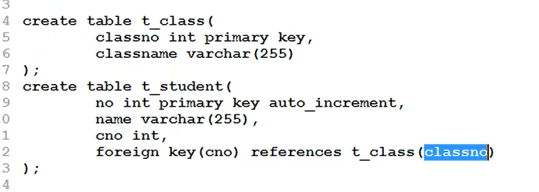 格式:在创建表的时候,创建外键,使用表级约束进行创建,在字段全部创建完后,在后续使用foreign key(编号字段) references 关联表(相同编号数据字段)