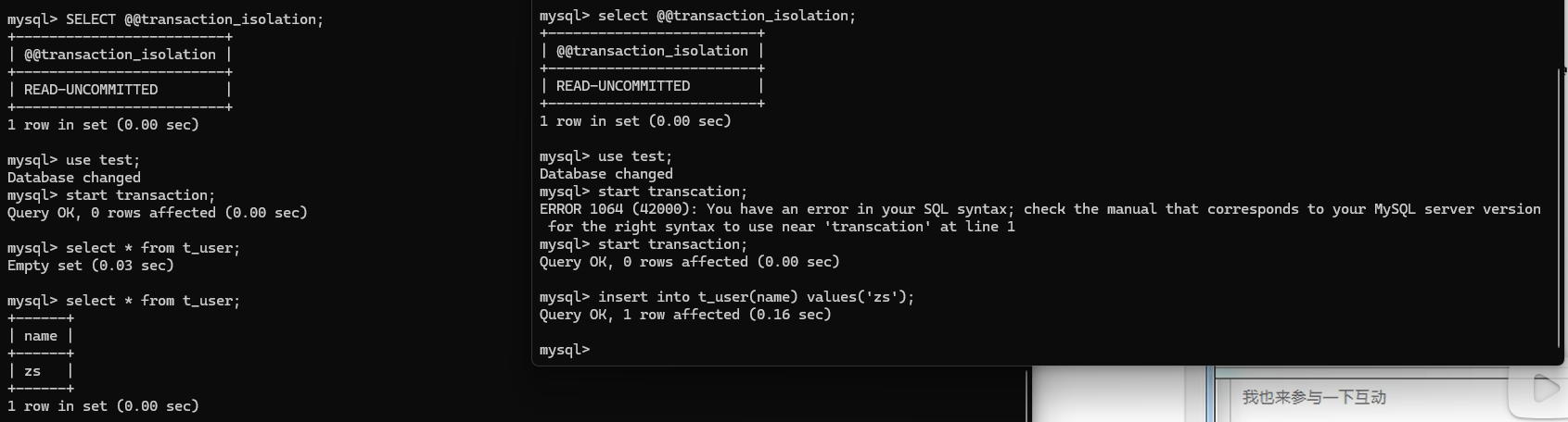- 测试read uncommitted隔离: