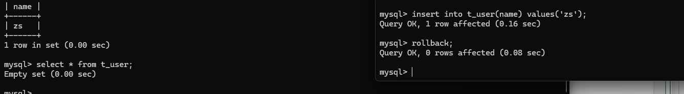 在事务执行过程中,我们可以提交事务,也可以回滚事务。