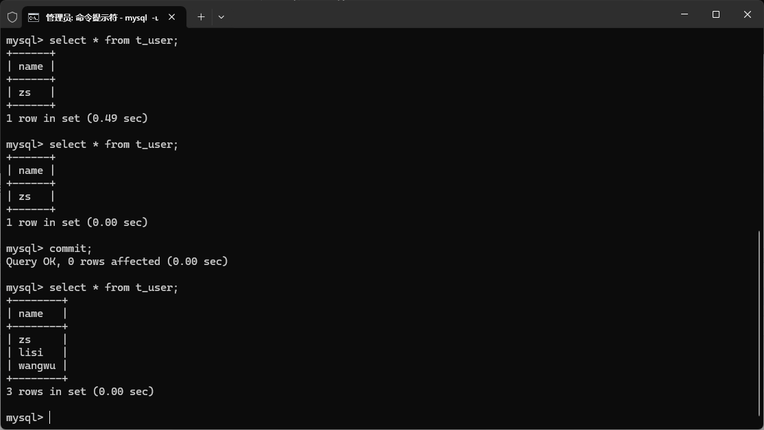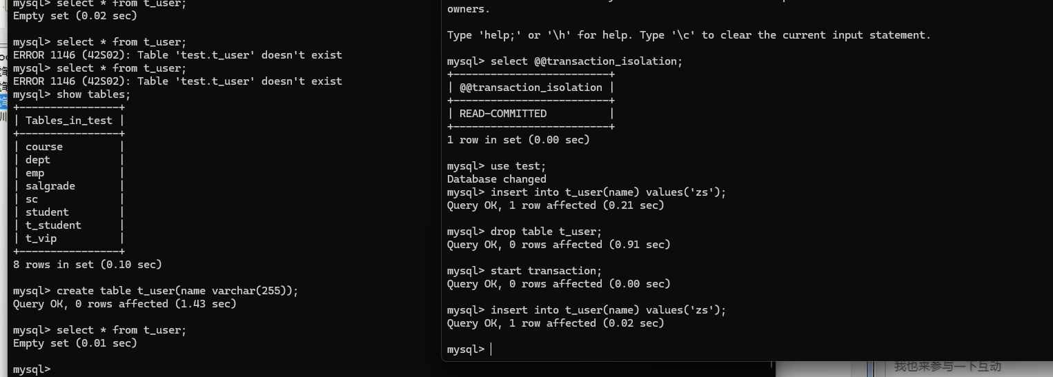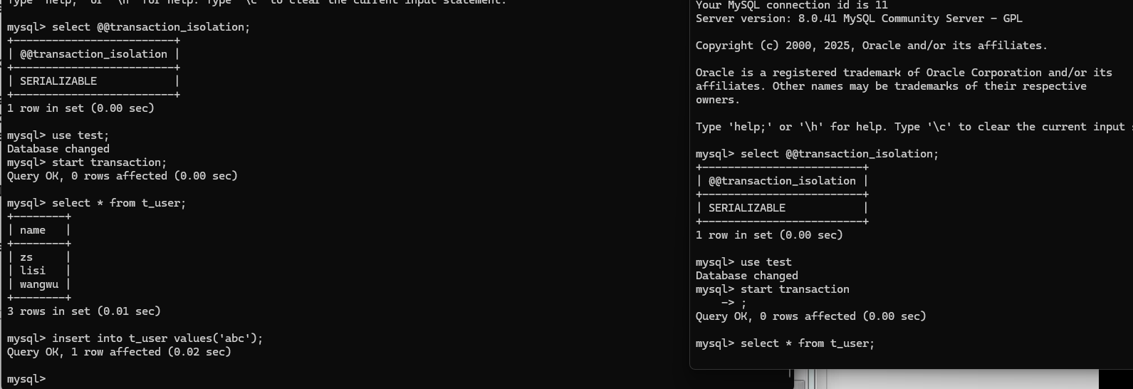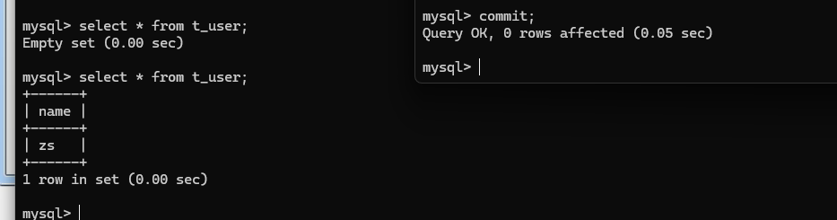 开两个终端进行事务验证,可以发现,两边都开手动提交,但是在事务未提交时,双方对数据的操作依然是实时更新的