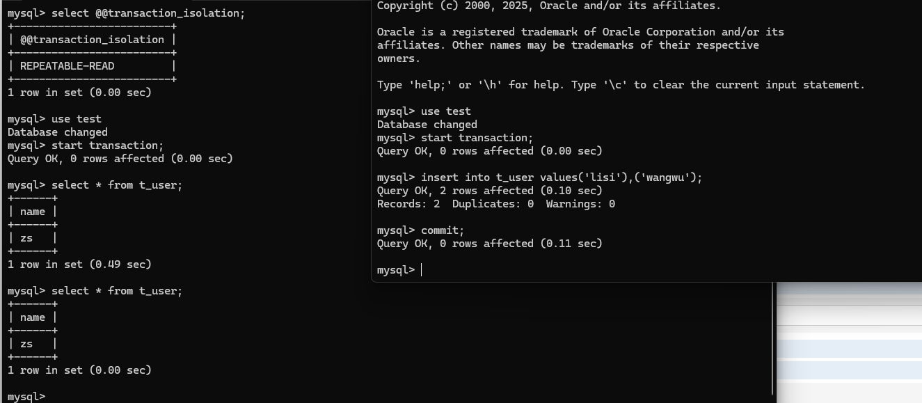 将数据库隔离级别切换成repeatable read,打开两个终端进行测试,都开启事务,一个终端只管查询,另外一个终端进行表的插值最后进行提交,查询的表最终再查一次看看结果:
