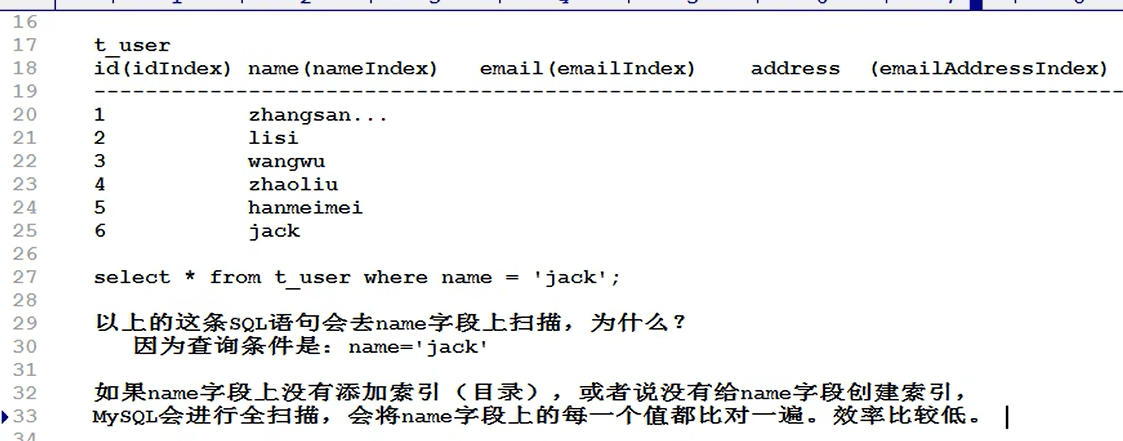 - 第二种:先通过目录(索引)去定位一个大概的范围位置,然后直接定位到这个位置,进行局部扫描,缩小扫描的范围,快速的查找。这种查找方式属于通过索引检索,效率比较高。