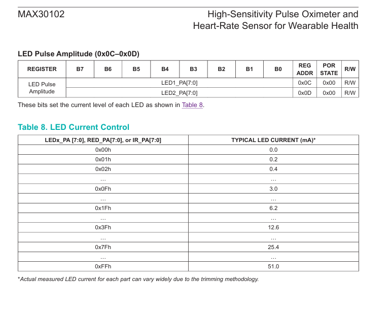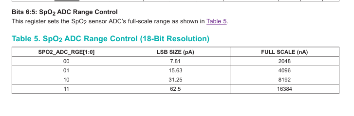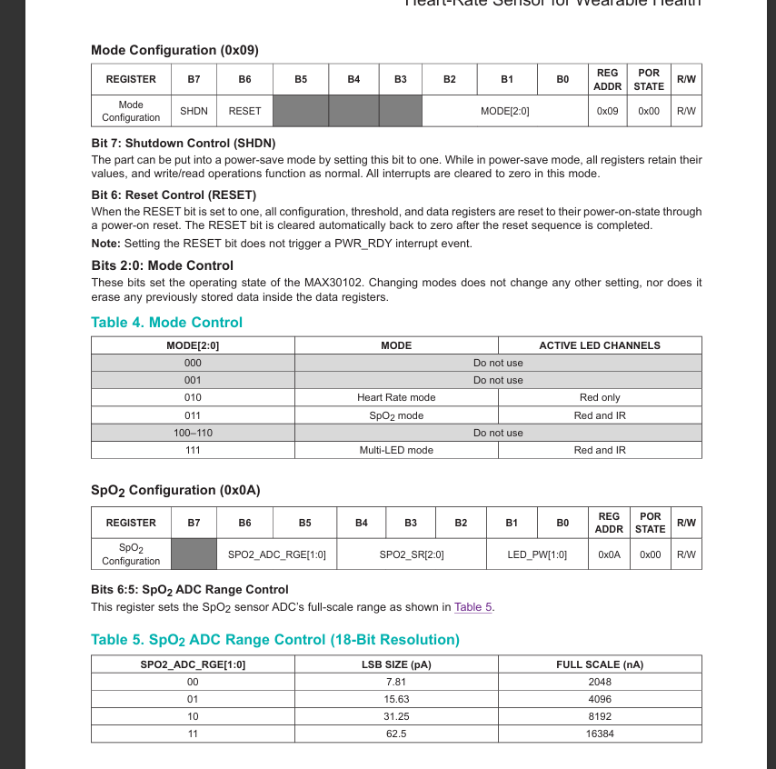 从表4中可以看见对模式的控制,当启动心率模式的时候在模式寄存器中写入010也就是0x02,当启动血氧模式的时候要往模式寄存器中写入011即0x03,这就是模式的控制了。