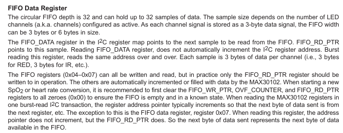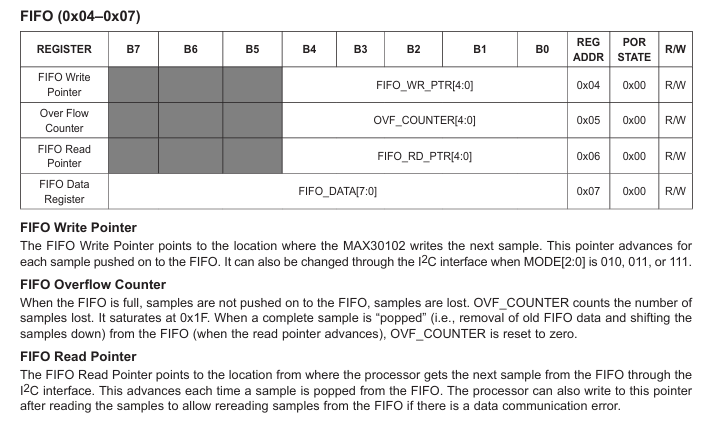 可以手动对这个数据存储器进行清空操作,就是把写指针直接写入0x00,这样在你复位写指针后,读指针会自动复位,但是你如果只复位读指针,写指针不会自动复位,而数据存储器,对于我来说,要开启心率血氧模式,它会自动记录红外光和红光的数据,这两个数据组成一个样本,一个样本占6个空间大小。FIFO存储数据的结构好像是循环队列。