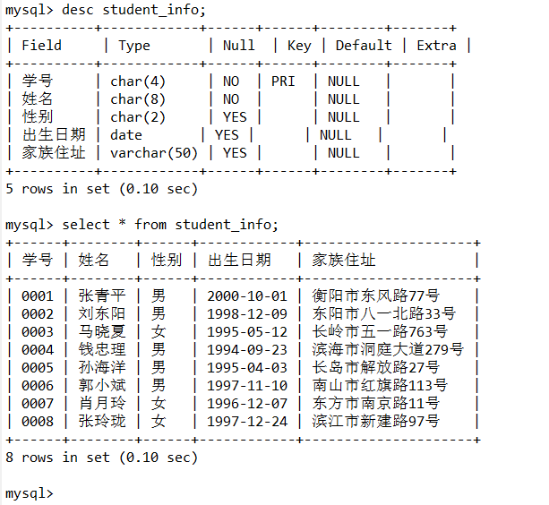 mysql> INSERT INTO student_info(学号,姓名,性别,出生日期,家族住址)