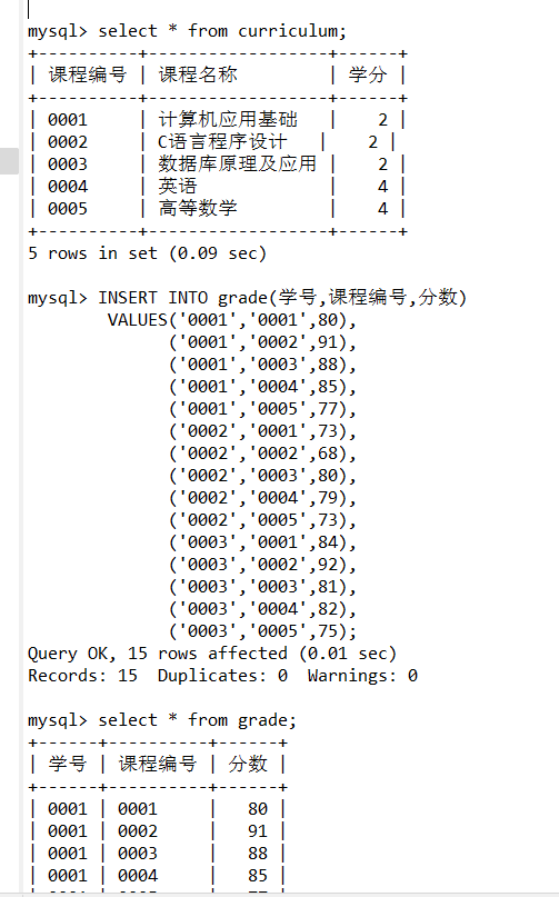 mysql> INSERT INTO grade(学号,课程编号,分数)