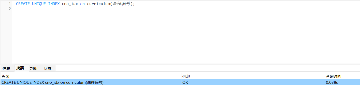 CREATE UNIQUE INDEX cno_idx on curriculum(课程编号)