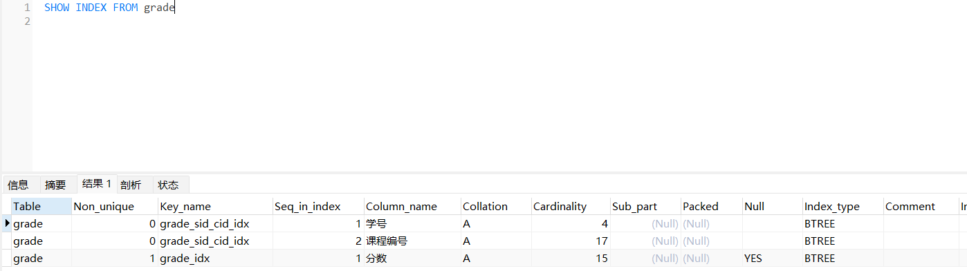 3.使用SQL语句为grade表的“分数”字段创建一个普通索引,命名为grade_idx。
