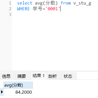 8.基于student_info表、curriculum表和grade表,建立一个名为v_stu_g的视图,视图包括所有学生的学号、姓名、课程名称、分数。使用视图v_stu_g查询学号为0001的学生的课程平均分