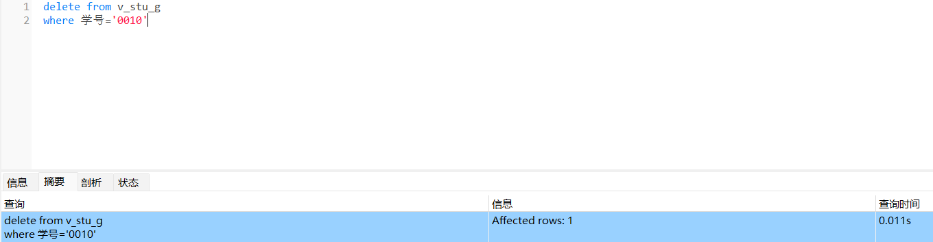 11.利用视图v_stu_g删除学号为0010的学生记录。