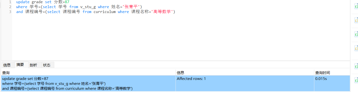 12.利用视图v_stu_g修改姓名为张青平的学生的高等数学的分数为87。