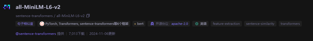 在 Hugging Face 或者 ModelScope 可以找到属于 sentence-transformers 的 all-MiniLM-L6-v2 模型。