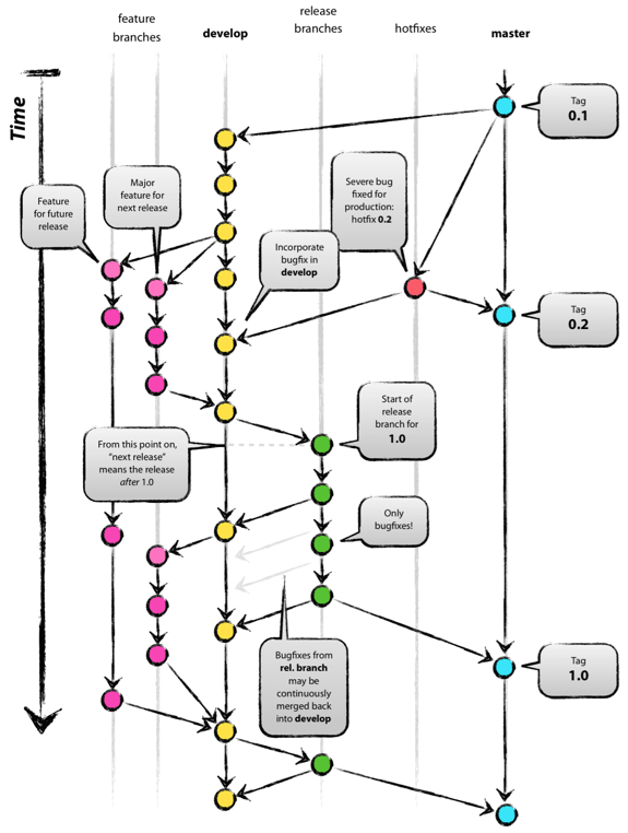 - 当有一组 feature 开发完成,首先会合并到 develop 分支,进入提测时,会创建 release 分支。