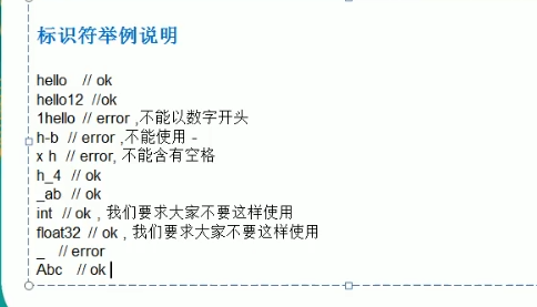 Golang中对各种变量,方法等命名时使用的字符序列(字符串)称为标识符- 凡是自己可以取名字的地方都叫标识符