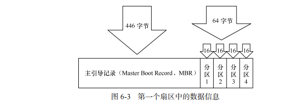 正是因为计算机有了硬盘设备,我们才可以在玩游戏的过程中或游戏通关之后随时存档,而不用每次重头开始。硬盘设备是由大量的扇区组成的,每个扇区的容量为 512 字节。其中第一个扇区最重要,它里面保存着主引导记录与分区表信息。就第一个扇区来讲,主引导记录需要占用 446 字节,分区表为 64 字节,结束符占用 2 字节;其中分区表中每记录一个分区信息就需要 16 字节,这样一来最多只有 4 个分区信息可以写到第一个扇区中,这 4 个分区就是 4 个主分区。第一个扇区中的数据信息如图所示。
