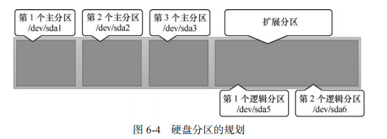 现在,问题来了—第一个扇区最多只能创建出 4 个分区?于是为了解决分区个数不够的问题,可以将第一个扇区的分区表中 16 字节(原本要写入主分区信息)的空间(称之为扩展分区)拿出来指向另外一个分区。也就是说,扩展分区其实并不是一个真正的分区,而更像是一个占用 16 字节分区表空间的指针—一个指向另外一个分区的指针。这样一来,用户一般会选择使用 3 个主分区加 1 个扩展分区的方法,然后在扩展分区中创建出数个逻辑分区,从而来满足多分区(大于 4 个)的需求。当然,就目前来讲大家只要明白为什么主分区不能超过 4 个就足够了。主分区、扩展分区、逻辑分区可以像图 6-4 那样来规划。