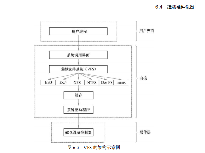 所示为 VFS 的架构示意图。从中可见,实际文件系统在 VFS 下隐藏了自己的特性和细节,这样用户在日常使用时会觉得“文件系统都是一样的”,也就可以随意使用各种命令在任何文件系统中进行各种操作了(比如使用 cp 命令来复制文件)。