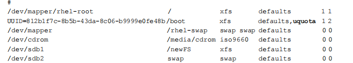 如果想将文件系统为 ext4 的硬件设备/dev/sdb2 在开机后自动挂载到/backup 目录上,并保持默认权限且无需开机自检,就需要在/etc/fstab 文件中写入下面的信息,这样在系统重启后也会成功挂载