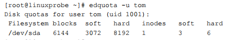 在为用户设置了 quota 磁盘容量配额限制后,可以使用 edquota 命令按需修改限额的数值。其中,-u参数表示要针对哪个用户进行设置;-g 参数表示要针对哪个用户组进行设置。edquota 命令会调用 Vi 或 Vim 编辑器来让 root 管理员修改要限制的具体细节。下面把用户 tom 的硬盘使用量的硬限额从 5MB 提升到 8MB: