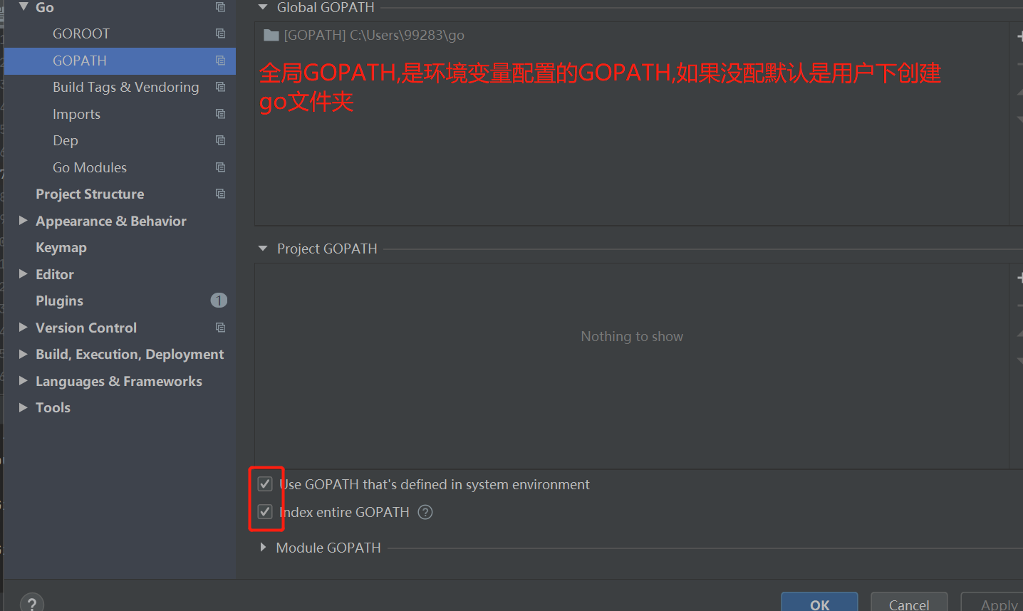 此时全局 GOPATH 会存在一个我们安装 GO 时配置环境变量时的 GOPATH,这个不用管也删不掉,之后我们所有下载的外部模块都会保存在这个全局 GOPATH 里面而不是我们的项目里面!!!这是重点!!!