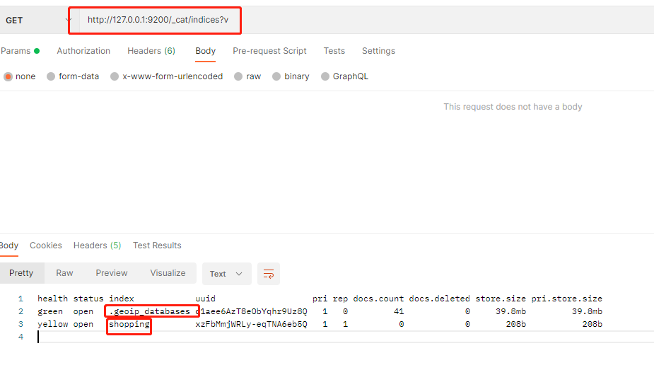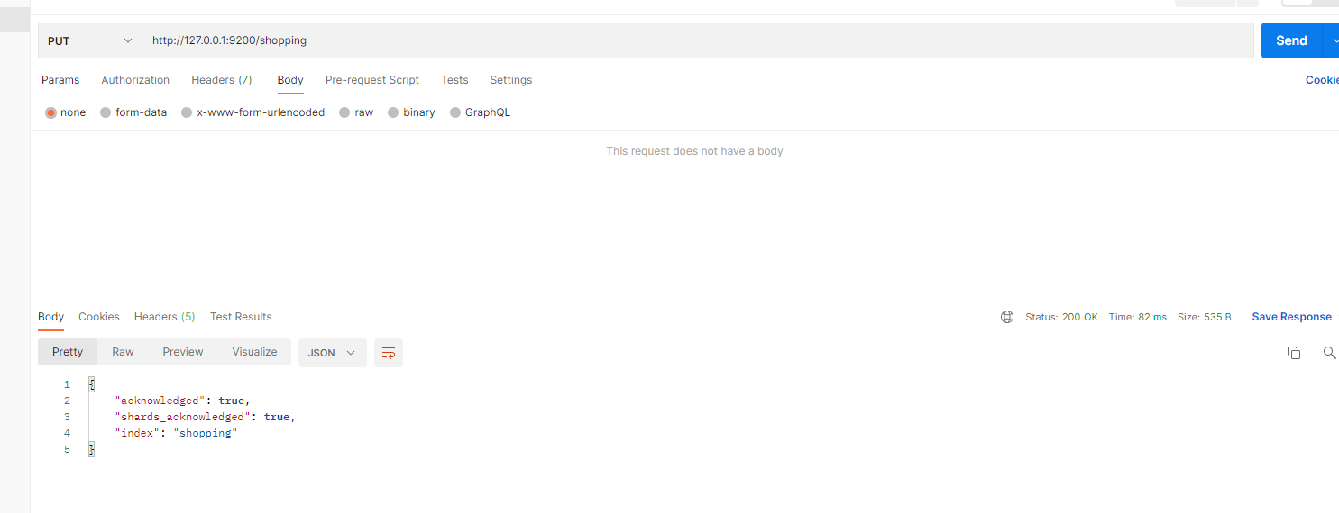 对比关系型数据库,创建索引就等同于创建数据库,Postman中向ES 服务器发送PUT请求:http:127.0.0.1:8200/shopping 创建一个shopping的index
