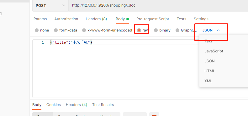 在Postman中 向ES 服务器发送POST请求,http://127.0.0.1:9200/shopping/_doc _doc表示索引中添加文档