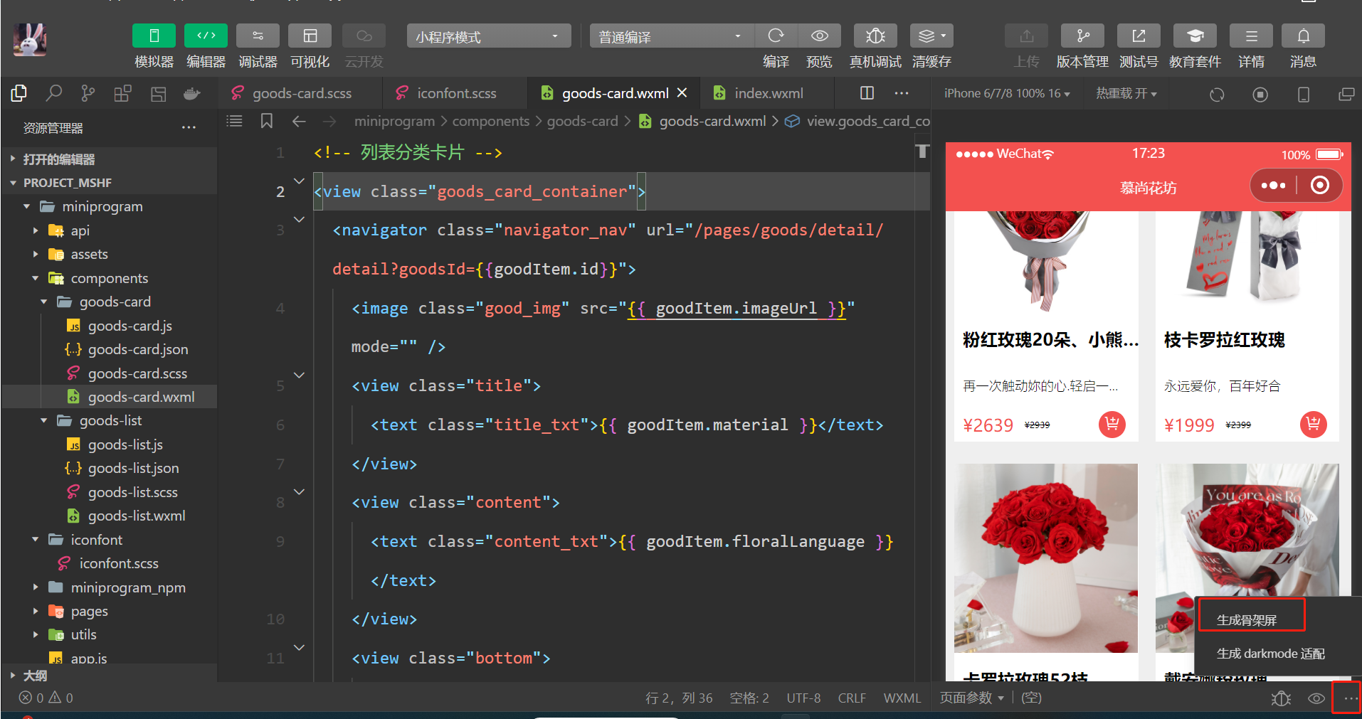 1. 使用微信开发者工具为当前正在预览的页面生成骨架屏代码, 工具入口位于模拟器面板右下角的三点处
