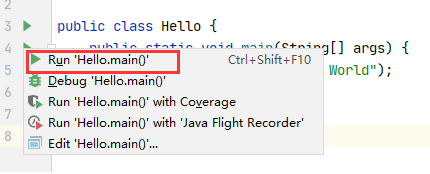 public class Hello { public static void main(String[] args) { System.out.println("Hello World"); } } 通过System.out.println("Hello World");输出语句,在括号中填写想要输出的内容 点击运行按钮开始运行代码