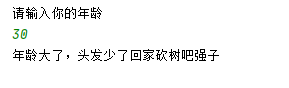 System.out.println("请输入你的年龄"); int i = sc.nextInt(); if (i<a){ System.out.println("你的年龄是美好的"); }else { System.out.println("年龄大了,头发少了回家砍树吧强子"); }