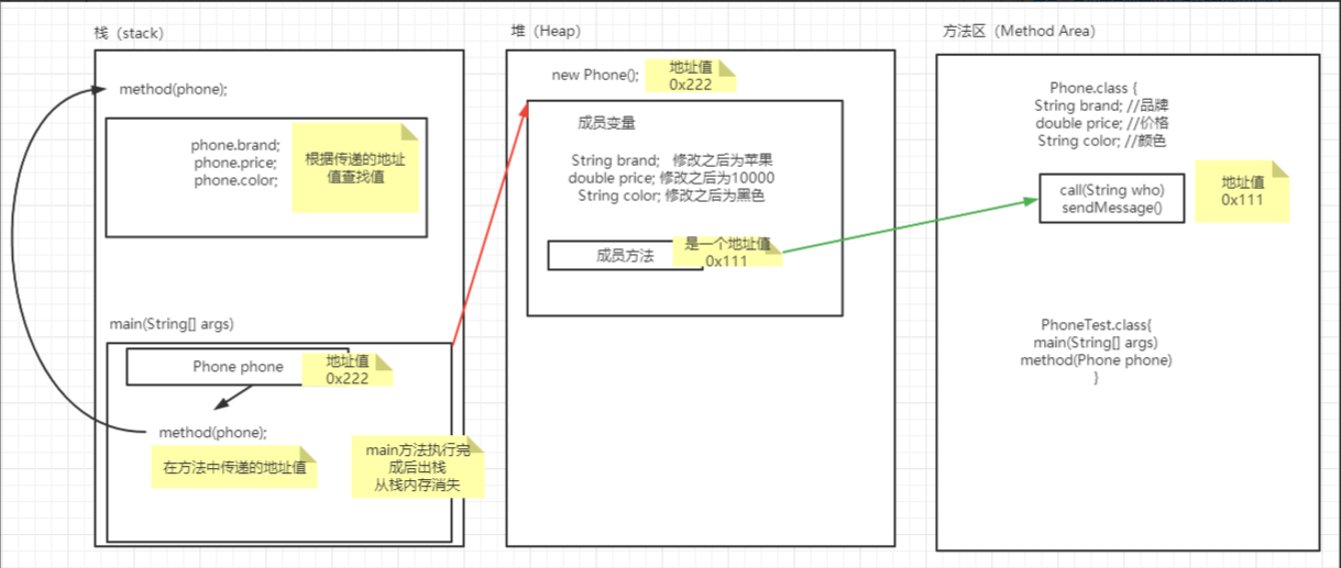 public class PhoneTest { public static void main(String[] args) { Phone phone = new Phone(); phone.brand = "苹果"; phone.price = 10000; phone.color = "黑色"; method(phone); } public static void method(Phone phone){ System.out.println(phone.brand); System.out.println(phone.price); System.out.println(phone.color); } }