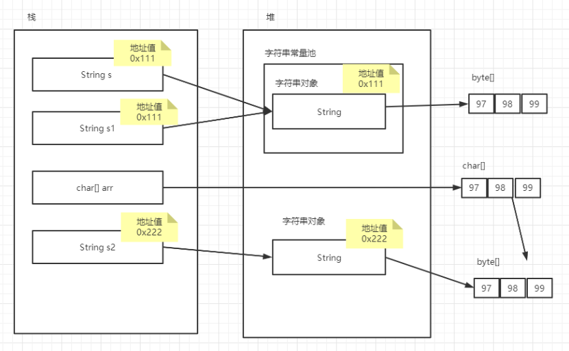public static void main(String[] args) { String str1 = "abc"; String str2 = "abc"; char[] charArray = {'a','b','c'}; String str3 = new String(charArray); System.out.println(str1 ==str2); System.out.println(str1 == str3); System.out.println(str2 == str3); }