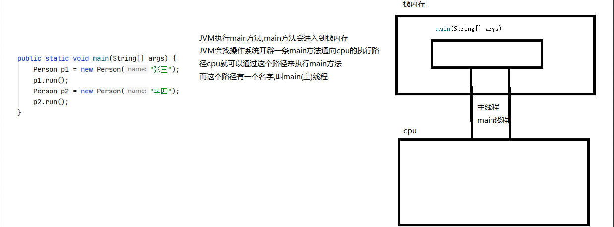 public static void main(String[] args) { Person p1 = new Person("小强"); p1.run(); }