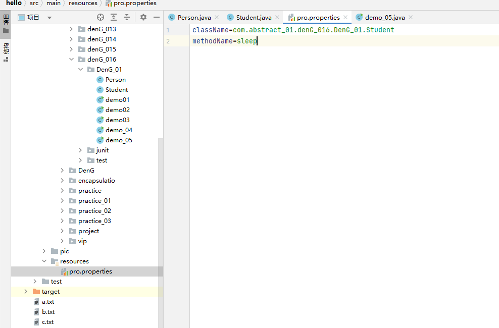 /* 框架类 */ public class demo_05 { public static void main(String[] args) throws Exception { //可以创建任意类的对象,可以执行任意方法 /* 前提:不能改变该类的任何代码,可以创建任意类的对象,可以执行任意方法 */ // Person person = new Person(); // person.eat(); // Student student = new Student(); // student.sleep(); //1.加载配置文件 //1.1创建Properties对象 Properties pro = new Properties(); //1.2加载配置文件,转换为一个集合 //1.2.1获取class目录下的配置文件(获取对应文件下的加载器) ClassLoader classLoader = demo_05.class.getClassLoader();//getClassLoader():加载器 InputStream resourceAsStream = classLoader.getResourceAsStream("pro.properties");//资源对应的字节流 pro.load(resourceAsStream); //传入字节流 //2.获取配置文件中定义的数据 String className = pro.getProperty("className"); String methodName = pro.getProperty("methodName"); //3.加载该类进内存 Class<?> aClass = Class.forName(className); //4.创建对象 Object o = aClass.newInstance(); //5.获取方法对象 Method method = aClass.getMethod(methodName); //6.执行方法 method.invoke(o); } }