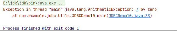 public static void main(String[] args) { Connection conn = null; PreparedStatement prep1 = null; PreparedStatement prep2 = null; try { //1.获取连接 conn = JDBCUtils.getConnection();//2.定义sql //2.1张三 - 500 String sql1 = "update account set balance = balance - ? where id = ?"; //2.2李四 + 500 String sql2 = "update account set balance = balance + ? where id = ?"; //3.获取执行sql对象 prep1 = conn.prepareStatement(sql1); prep2 = conn.prepareStatement(sql2); //4.给?设置参数 prep1.setDouble(1, 500); prep1.setInt(2, 1); //---------------------------------------- prep2.setDouble(1, 500); prep2.setInt(2, 1); //5.执行sql prep1.executeUpdate(); // //手动制造异常 int i = 3/0; prep2.executeUpdate(); } catch (Exception e) { e.printStackTrace(); }finally { JDBCUtils.close(prep1, conn); JDBCUtils.close(prep2, null); } }