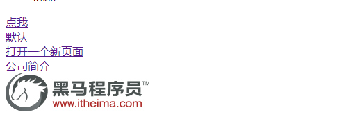 <!--超链接 a--> <a href="https://www.baidu.com/">点我</a> <br> <a href="https://www.baidu.com/" target="_self">默认</a><!--默认页面--> <br> <a href="https://www.baidu.com/" target="_blank">打开一个新页面</a><!--打开一个新页面--> <br> <a href="3_HelloWorld.html">公司简介</a><!--跳自己的页面--> <br> <a href="http://www.baidu.com"><img src="image/logo.jpg" alt="黑马程序员" height="" width=""></a><!--图片超链接-->