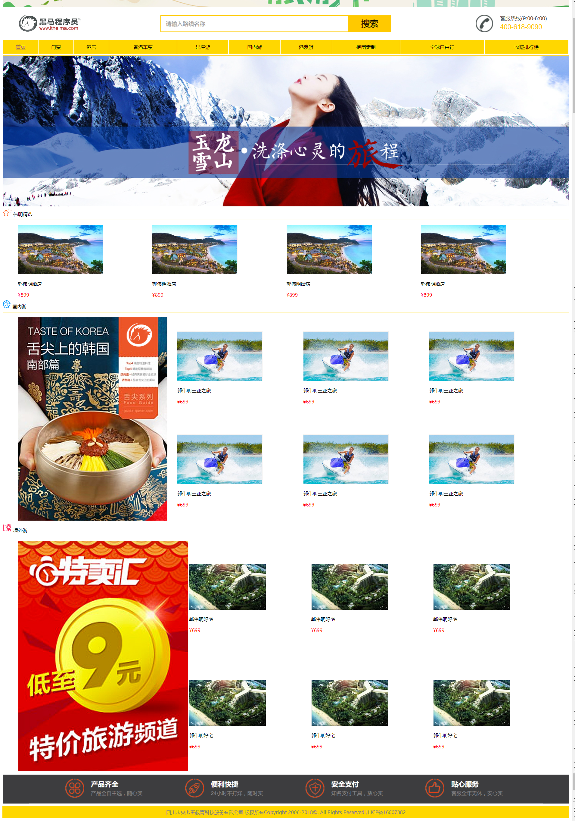 <!DOCTYPE html> <html lang="en"> <head> <meta charset="UTF-8"> <title>旅游网页</title> </head> <body> <!--采用table来完成布局--> <!--最外层的table,用于整个页面的布局--> <table width="100%" align="center"> <!--第1行--> <tr> <td> <img src="image/top_banner.jpg" width="100%"> </td> </tr> <!--第2行--> <tr> <td> <table width="100%" align="center"><!--嵌套表格--> <tr align="center"><!--align:对齐方式--> <td> <img src="image/logo.jpg" alt=""> </td> <td> <img src="image/search.png" alt=""> </td> <td> <img src="image/hotel_tel.png" alt=""> </td> </tr> </table> </td> </tr> <!--第3行--> <tr> <td> <table width="100%" align="center"><!--嵌套表格--> <tr bgcolor="#ffd700" align="center" height="45"><!--bgcolor:颜色 align:对齐方式 height:高度--> <td> <a href="">首页</a> </td> <td> 门票 </td> <td> 酒店 </td> <td> 香港车票 </td> <td> 出境游 </td> <td> 国内游 </td> <td> 港澳游 </td> <td> 抱团定制 </td> <td> 全球自由行 </td> <td> 收藏排行榜 </td> </tr> </table> </td> </tr> <!--第4行--> <tr> <td> <img src="image/banner_3.jpg" alt="" width="100%"> </td> </tr> <!--第6行--> <tr> <td> <img src="image/icon_5.jpg" alt="" > 伟明精选 <hr color="ffd700" > </td> </tr> <!-- 第6行--> <tr> <td> <table width="95%" align="center"> <tr> <td> <img src="image/jiangxuan_1.jpg"> <p>郭伟明婚房</p> <font color="red">¥899</font> </td> <td> <img src="image/jiangxuan_1.jpg"> <p>郭伟明婚房</p> <font color="red">¥899</font> </td> <td> <img src="image/jiangxuan_1.jpg"> <p>郭伟明婚房</p> <font color="red">¥899</font> </td> <td> <img src="image/jiangxuan_1.jpg"> <p>郭伟明婚房</p> <font color="red">¥899</font> </td> </tr> </table> </td> </tr> <!--第7行--> <tr> <td> <img src="image/icon_6.jpg" alt=""> 国内游 <hr color="ffd700"> </td> </tr> <!--第8行--> <tr> <td> <table width="95%" align="center"> <tr> <td rowspan="2"> <img src="image/guonei_1.jpg" alt="" width="95%"> </td> <td> <img src="image/jiangxuan_2.jpg" height="100%"> <p>郭伟明三亚之旅</p> <font color="red">¥699</font> </td> <td> <img src="image/jiangxuan_2.jpg"> <p>郭伟明三亚之旅</p> <font color="red">¥699</font> </td> <td> <img src="image/jiangxuan_2.jpg"> <p>郭伟明三亚之旅</p> <font color="red">¥699</font> </td> </tr> <tr> <td> <img src="image/jiangxuan_2.jpg"> <p>郭伟明三亚之旅</p> <font color="red">¥699</font> </td> <td> <img src="image/jiangxuan_2.jpg"> <p>郭伟明三亚之旅</p> <font color="red">¥699</font> </td> <td> <img src="image/jiangxuan_2.jpg"> <p>郭伟明三亚之旅</p> <font color="red">¥699</font> </td> </tr> </table> </td> </tr> <!--第9行--> <tr> <td> <img src="image/icon_7.jpg"> 境外游 <hr color="ffd700"> </td> </tr> <!--第10行--> <tr> <td> <table width="95%" align="center"> <tr> <td rowspan="2"> <img src="image/jiangwai_1.jpg" width="100%"> </td> <td> <img src="image/jiangxuan_3.jpg" height="100%"> <p>郭伟明好宅</p> <font color="red">¥699</font> </td> <td> <img src="image/jiangxuan_3.jpg"> <p>郭伟明好宅</p> <font color="red">¥699</font> </td> <td> <img src="image/jiangxuan_3.jpg"> <p>郭伟明好宅</p> <font color="red">¥699</font> </td> </tr> <tr> <td> <img src="image/jiangxuan_3.jpg"> <p>郭伟明好宅</p> <font color="red">¥699</font> </td> <td> <img src="image/jiangxuan_3.jpg"> <p>郭伟明好宅</p> <font color="red">¥699</font> </td> <td rowspan="2"> <img src="image/jiangxuan_3.jpg"> <p>郭伟明好宅</p> <font color="red">¥699</font> </td> </tr> </table> </td> </tr> <!--第11行--> <tr> <td> <img src="image/footer_service.png" width="100%"> </td> </tr> <!--第12行--> <tr> <td bgcolor="#ffd700" align="center" height="40"> <font color="gray"> 四川未央老王教育科技股份有限公司 版权所有Copyright 2006-2018©, All Rights Reserved 川ICP备16007882 </font> </td> </tr> </table> </body> </html>