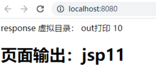 <%@ page contentType="text/html;charset=UTF-8" language="java" %> <html> <head> <title>$Title$</title> </head> <body> <% System.out.println("控制台打印:hello,jsp"); int i = 10; String contextPath = request.getContextPath(); out.println("虚拟目录:"+contextPath); out.println("out打印"); %> <%! int i = 5; %> <%= i %> <h1>页面输出:jsp11</h1> <% response.getWriter().write("response");%> </body> </html>