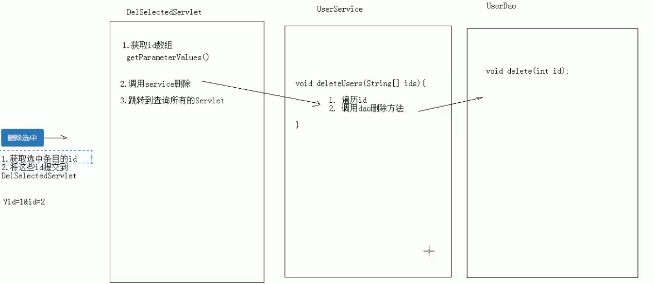 @Override public void delSelectedUser(String[] ids) { if (ids != null && ids.length > 0){ //1.遍历数组 for (String id : ids) { //2.调用dao删除 dao.delete(Integer.parseInt(id)); } } } }