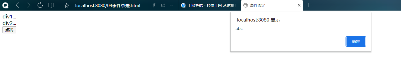 <!DOCTYPE html> <html lang="en"> <head> <meta charset="UTF-8"> <title>事件绑定</title> <script src="js/jquery-3.3.1.min.js"></script> </head> <body> <div id="div1"> div1... </div> <div id="div2"> div2... </div> <input type="button" value="点我" id="b1"> <script> //给b1按钮添加事件 //获取b1按钮 $("#b1").click(function () { // click:点击事件 alert("abc"); }); </script> </body> </html>