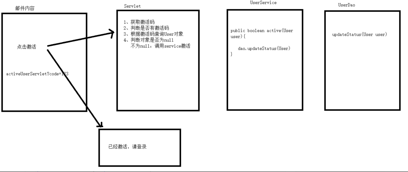/** * 激活用户 * @param code * @return */ @Override public boolean active(String code) { //1.根据激活码查询用户对象 User user = userDao.findByCode(code); if(user != null){ //2.调用dao的修改激活状态的方法 userDao.updateStatus(user); return true; }else{ return false; } }