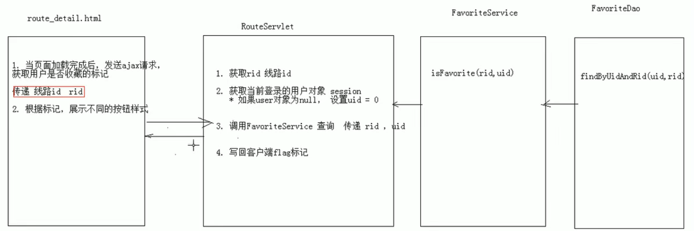 /** * 判断当前登录用户是否收藏过该线路 * @param request * @param response * @throws ServletException * @throws IOException */ public void isFavorite(HttpServletRequest request, HttpServletResponse response) throws IOException { //1.获取线路id String rid = request.getParameter("rid"); //2.获取当前登录的用户 user User user = (User) request.getSession().getAttribute("user"); int uid; if (user == null){ //用户尚未登录 uid = 0; }else{ //用户已经登录 uid = user.getUid(); } //3.调用FavoritService查询是否收藏 boolean favorite = favoriteService.isFavorite(rid, uid); //4.写回客户端 writeValue(favorite, response); }