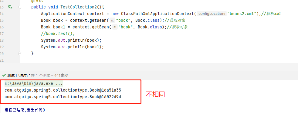 @Test public void TestCollection(){ ApplicationContext context = new ClassPathXmlApplicationContext("beans3.xml");//解析xml Course book = context.getBean("MyBean", Course.class);//获取对象 //book.test();//输出 //普通bean System.out.println(book);//com.atguigu.spring5.factorybean.MyBean@27f723 }