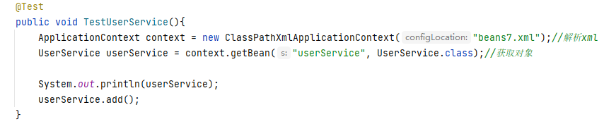 @Test public void TestUserService2(){ //加载配置类 ApplicationContext context = new AnnotationConfigApplicationContext(SpringConfig.class); UserService userService = context.getBean("userService", UserService.class);//获取对象 System.out.println(userService); userService.add(); }