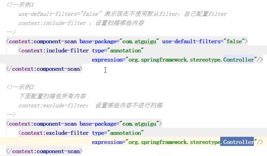 <?xml version="1.0" encoding="UTF-8"?> <beans xmlns="http://www.springframework.org/schema/beans" xmlns:xsi="http://www.w3.org/2001/XMLSchema-instance" xmlns:p="http://www.springframework.org/schema/p" xmlns:util="http://www.springframework.org/schema/util" xmlns:context="http://www.springframework.org/schema/context" xsi:schemaLocation="http://www.springframework.org/schema/beans http://www.springframework.org/schema/beans/spring-beans.xsd http://www.springframework.org/schema/util http://www.springframework.org/schema/util/util-beans.xsd http://www.springframework.org/schema/context http://www.springframework.org/schema/context/spring-context.xsd"> <!-- 扫描组件 如果扫描多个包,多个包使用逗号隔开 --> <context:component-scan base-package="com.atguigu"/> </beans>