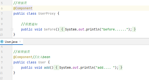 //增强类 public class UserProxy { //前置通知 public void before(){ System.out.println("before......"); } }