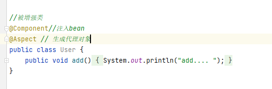 //增强类 @Component @Aspect // 生成代理对象 public class UserProxy { //前置通知 //@Before注解表示作为前置通知 @Before(value = "execution(* com.atguigu.spring5.aopanno.User.add(..))") public void before() { System.out.println("before......"); } //后置通知(返回通知) @AfterReturning(value = "execution(* com.atguigu.spring5.aopanno.User.add(..))") public void afterReturning() { System.out.println("afterReturning......"); } //最终通知 @After(value = "execution(* com.atguigu.spring5.aopanno.User.add(..))") public void after(){ System.out.println("after..."); } //异常通知 @AfterThrowing(value = "execution(* com.atguigu.spring5.aopanno.User.add(..))") public void afterthrowing(){ System.out.println("afterthrowing..."); } //环绕通知 @Around(value = "execution(* com.atguigu.spring5.aopanno.User.add(..))") public void around(ProceedingJoinPoint proceedingJoinPoint) throws Throwable { System.out.println("环绕之前..."); proceedingJoinPoint.proceed(); System.out.println("环绕之后"); } }