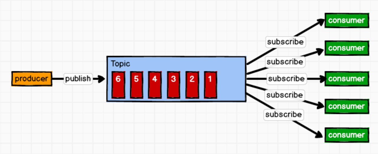 消息生产者(发布)将消息发布到topic中,同时有多个消息消费者(订阅)消费该消息。和点对点方式不同,发布到topic的消息会被所有订阅者消费。