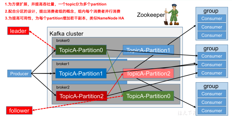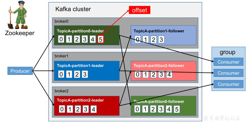 - Leader: 每个分区多个副本的“主”,生产者发送数据的对象,以及消费者消费数据的对象都是leader